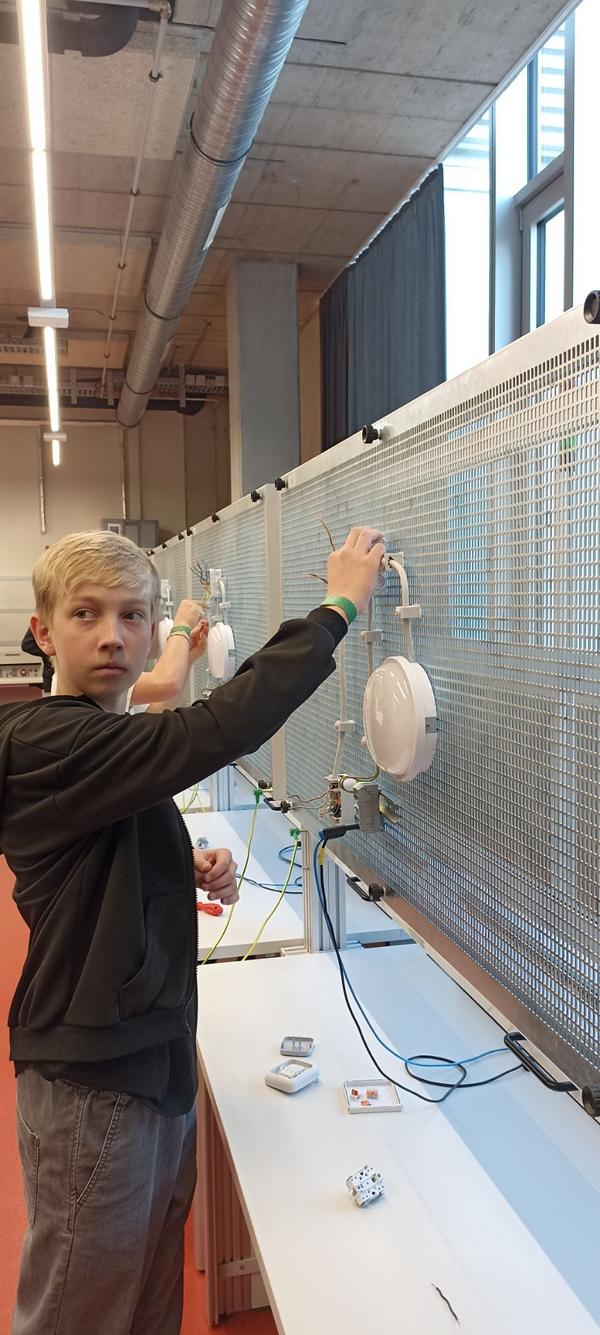 Unter der Aufsicht von Herrn Zeller erkundete die erste Gruppe zunächst den Bereich Elektro. Dort lernten die Jugendlichen, wie ein einfacher Stromkreis funktioniert – und durften diesen gleich selbst zusammenbauen. Weiter ging es in den Bereich Feinwerkmechanik, wo aus einem schlichten Metallstreifen ein gebogener Kleiderhaken für die Tür entstand. Präzision, Konzentration und handwerkliches Geschick waren hier gefragt – Eigenschaften, die in vielen Berufen unverzichtbar sind.