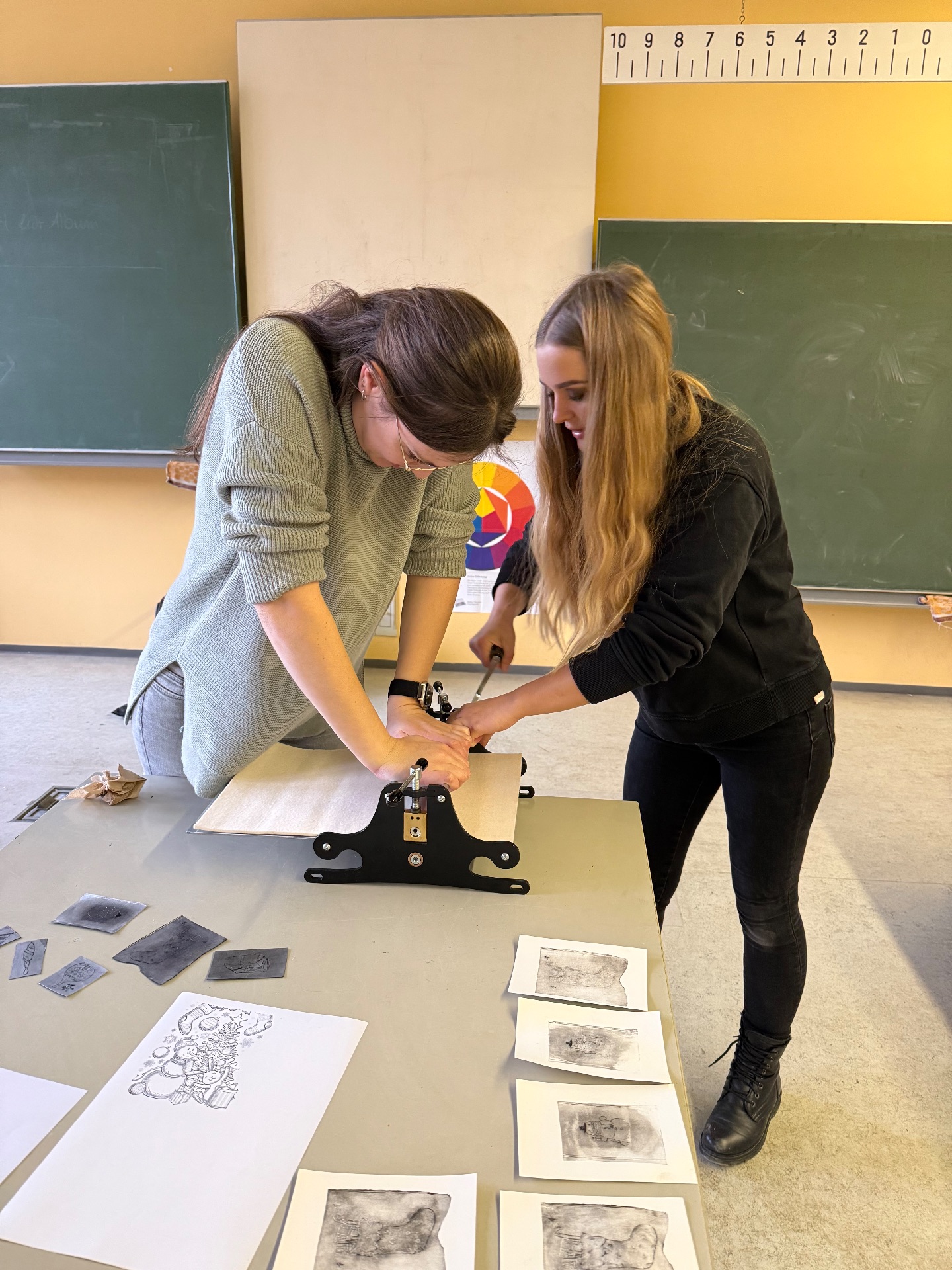 Nach einer kurzen Einführung in den Tiefdruck konnten alle selbst aktiv werden: Es wurden Motive entworfen, Druckplatten gestaltet und schließlich individuelle Weihnachtskarten gedruckt. Der praktische Zugang stand dabei im Vordergrund und lud zum Ausprobieren, Austauschen und gegenseitigen Inspirieren ein.