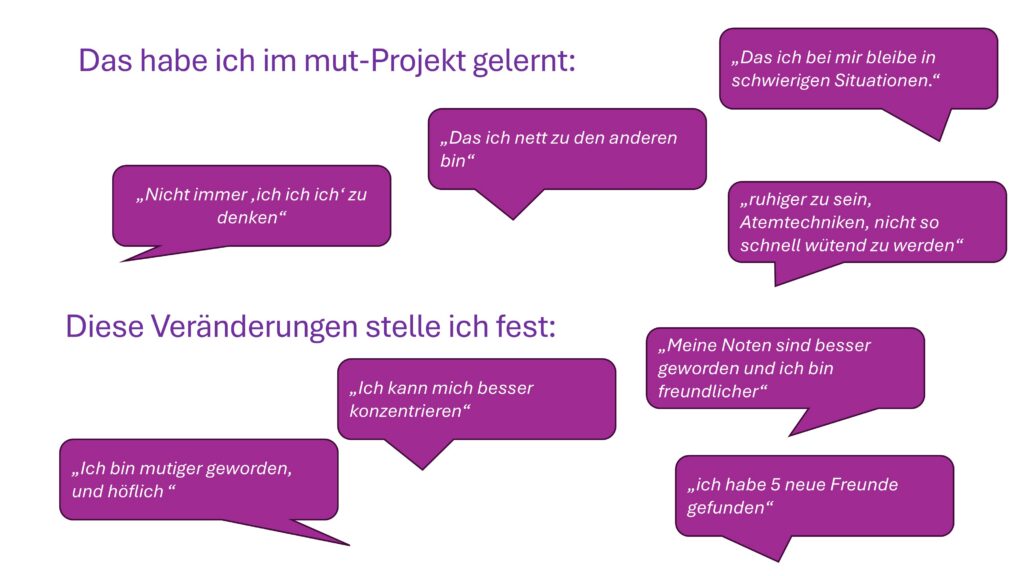 • „  Ich bin sicher, es bleibt viel hängen und bestärkt die menschlichen Werte und Charakter für nach der Schule. Mein Kind hatte im MUTProjekt wieder Lust und Spaß auf/an der Schule und hat sich wohl und sicher gefühlt.“